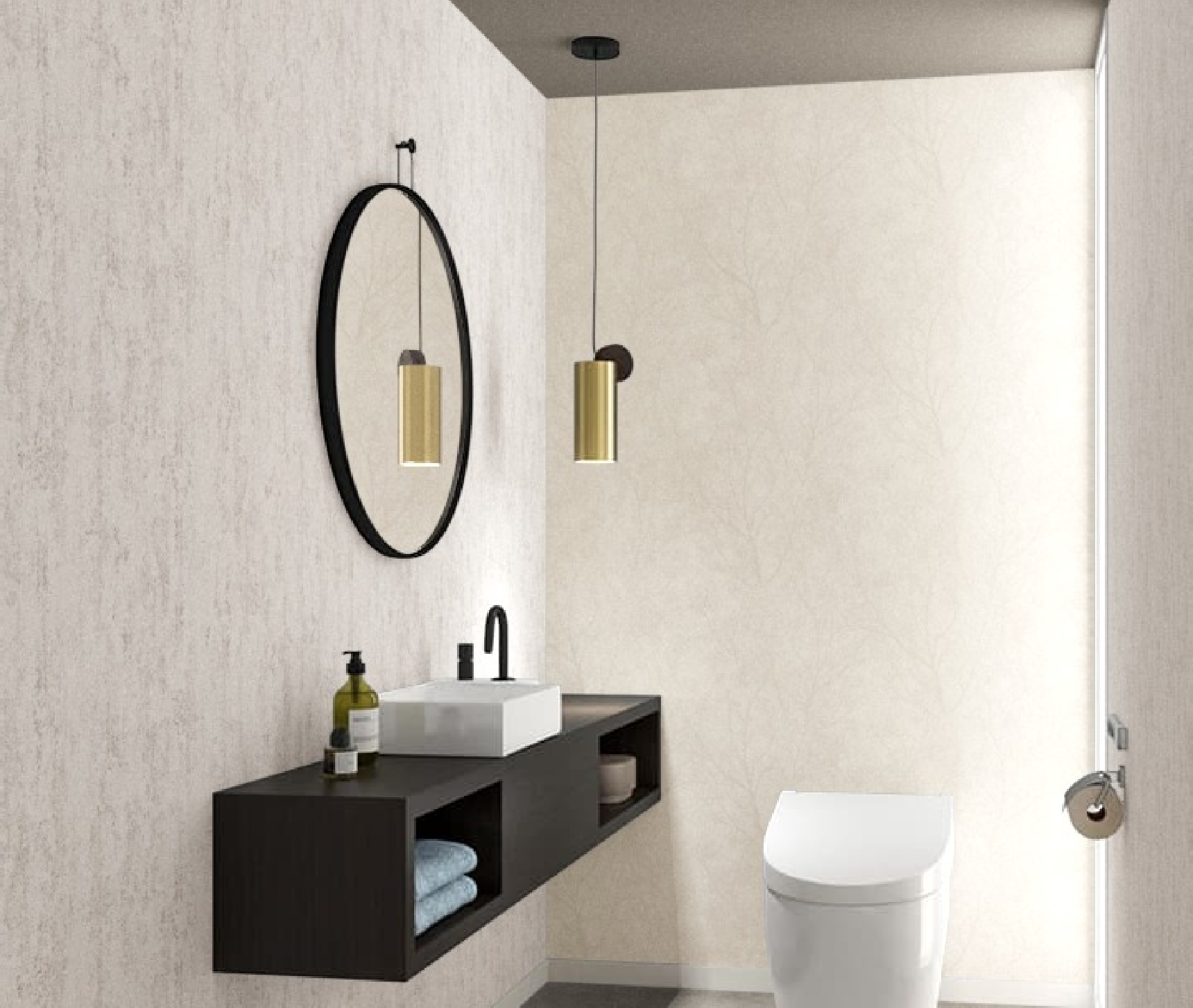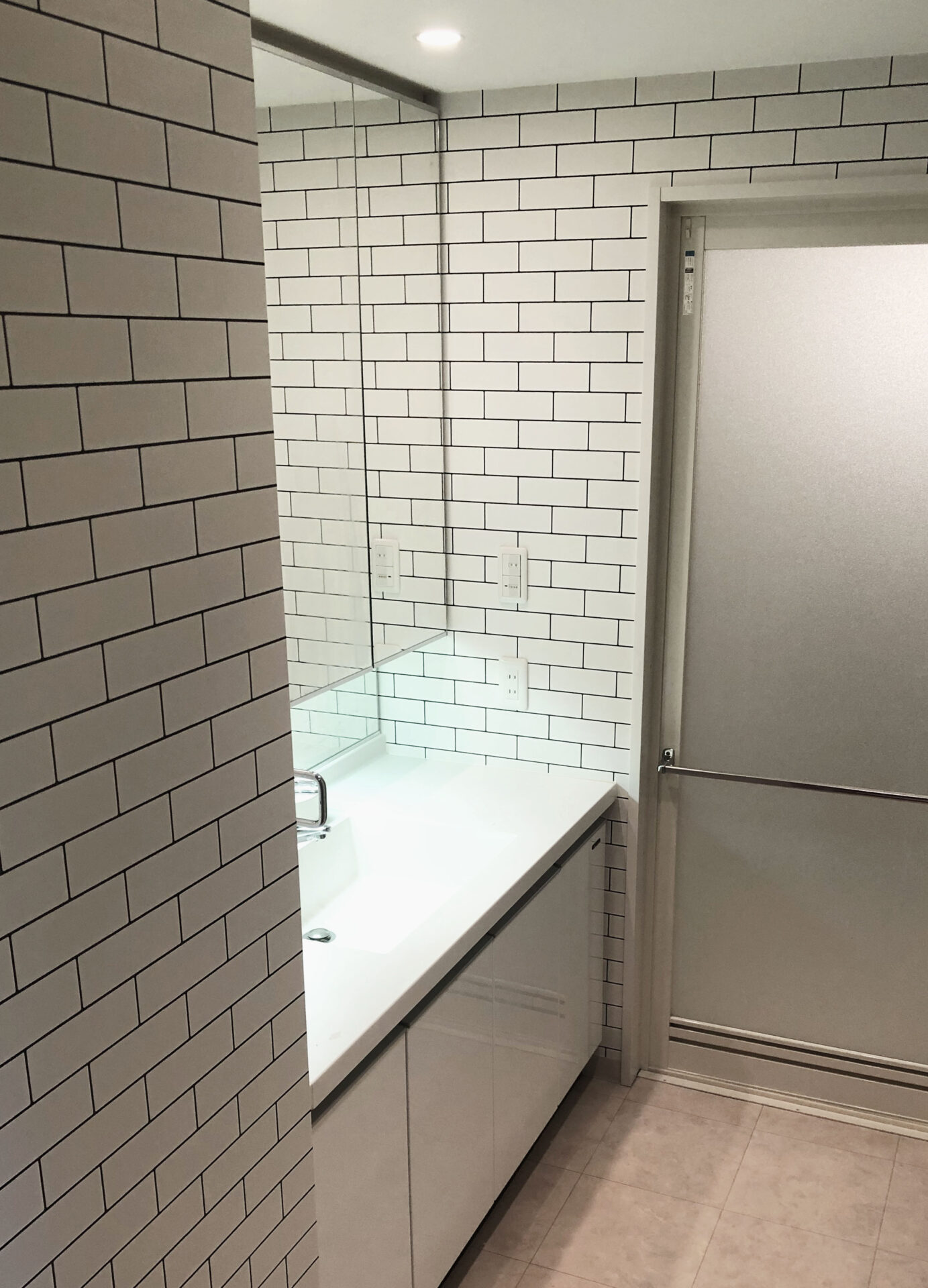 水廻りをグレーのクロスでスタイリッシュな空間に – クロスの貼り替えリフォームやコーディネートのご相談は茅ヶ崎のACS。