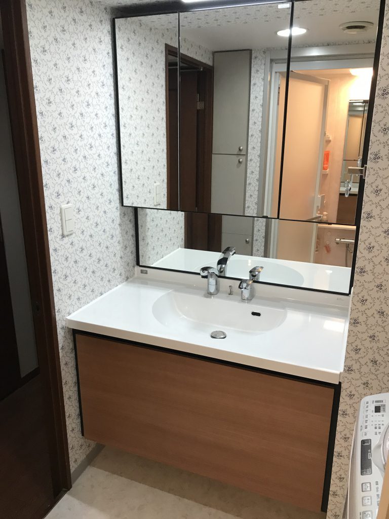 大田区の洗面リフォーム事例 使いやすい洗面台と白いクロス&床で、明るく快適な洗面所。