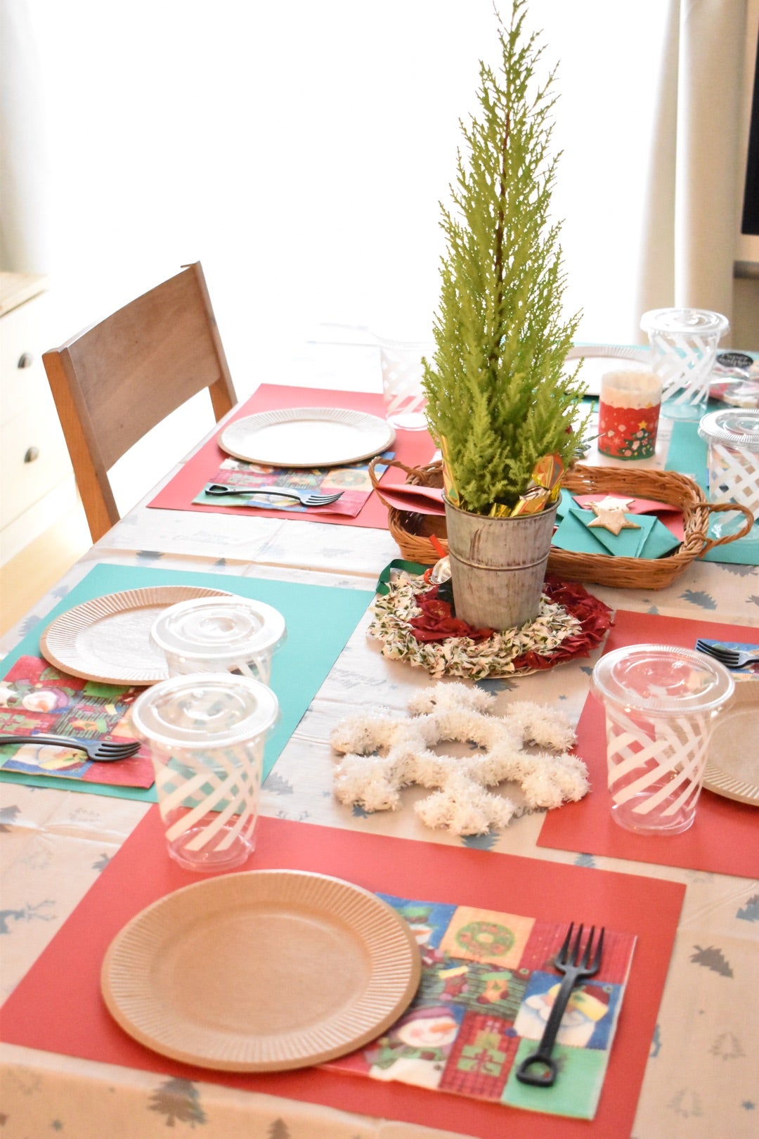 ダイソーのクリスマステーブルクロスと紙コップ・紙皿、100均でパーティ。