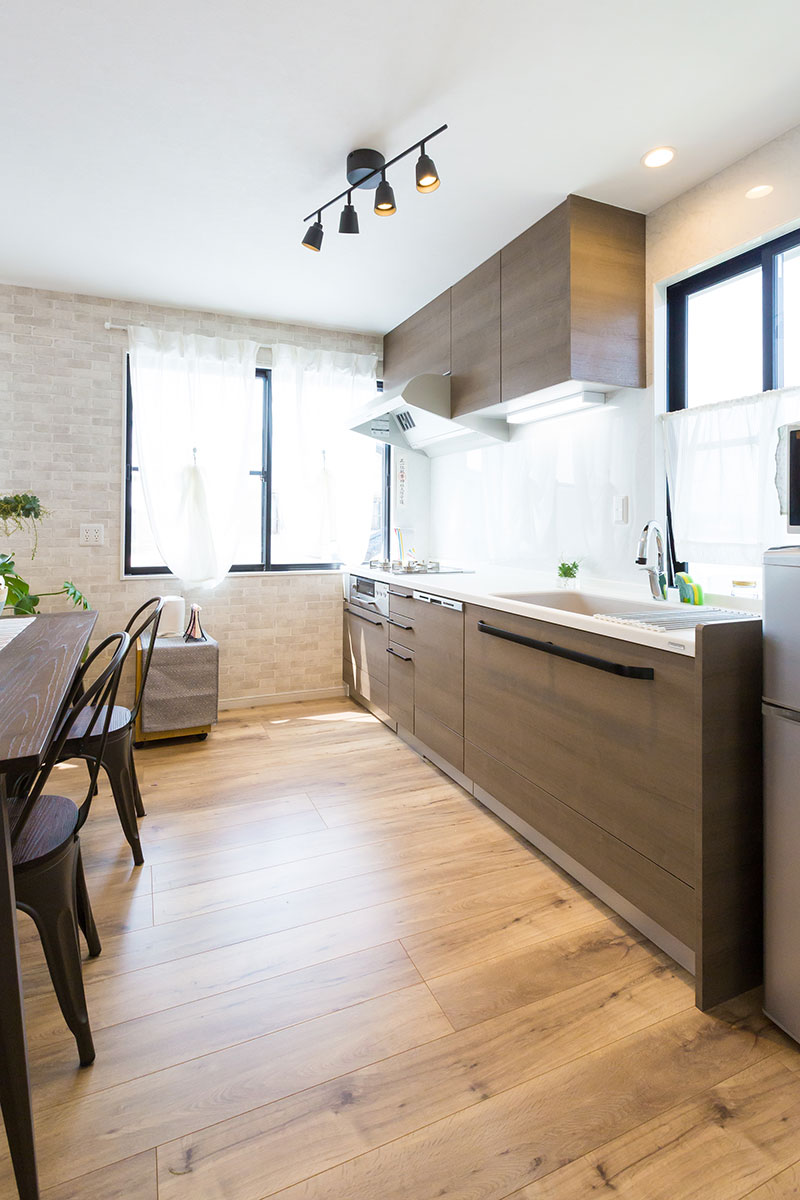 高い位置の吊り収納は設置せず、窓を配置することにより明るく広々と感じられるキッチンです。キッチンバックの棚は木で造作してゴミ箱を置くスペースも確保してあります♪ 明るく使い勝手の良いキッチンで楽しくお料理できそうですね♬キッチン収納キッチン収納。