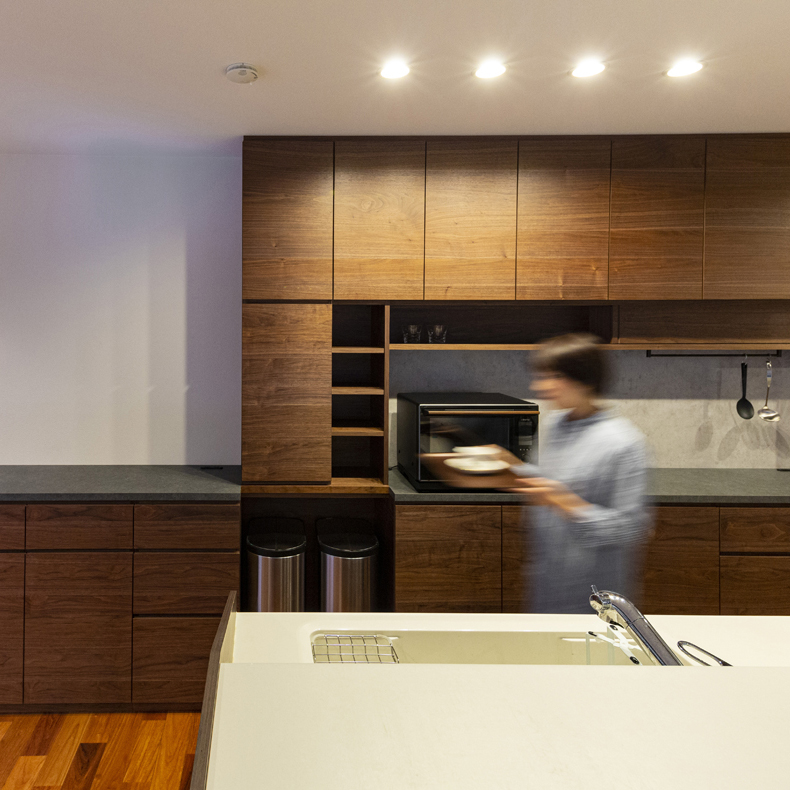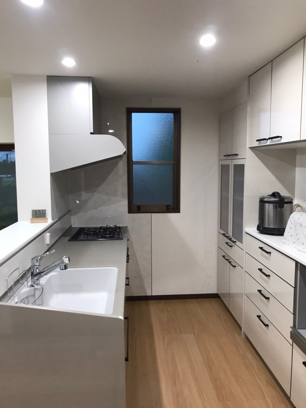 新築住宅のキッチン。 カップボードは造作しました。 〜キッチン配置〜 キッチン配置 は間取りによって壁付け、対面、アイランド、セパレート等々様々。写真のような対面キッチンはキッチン使用中も家族の様子を見やすい配置。現在、リフォームでの対面キッチン化は子育て。