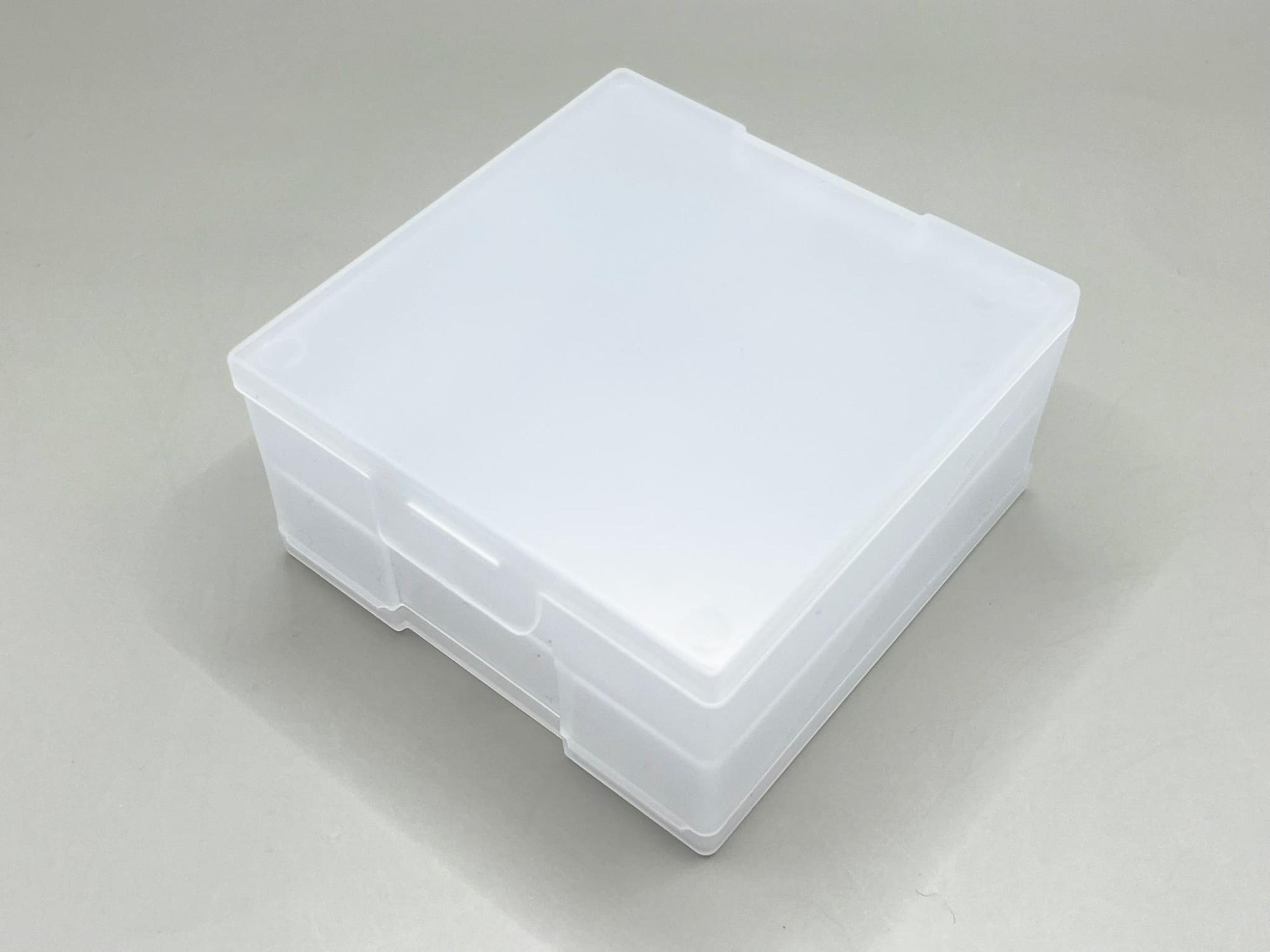 100均「フタ付きケース キューブ クリア」の商品情報とサイズ・収納例。セリアで販売 4977425201342。