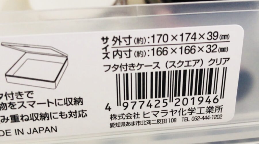100均「フタ付きケース スクエア クリア」の商品情報とサイズ・収納例。セリアで販売 4977425201946。