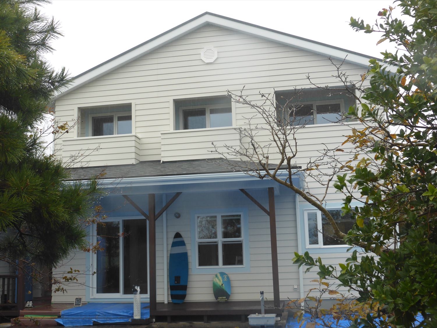 アメリカンスタイルなファサードのカバードポーチ付きの米軍ハウスを参考にカジュアルな白い外観 - 事例写真「オールディーズのアメリカ住宅 をイメージしたガレージ付き平屋の家」注文住宅のハウスネットギャラリ。