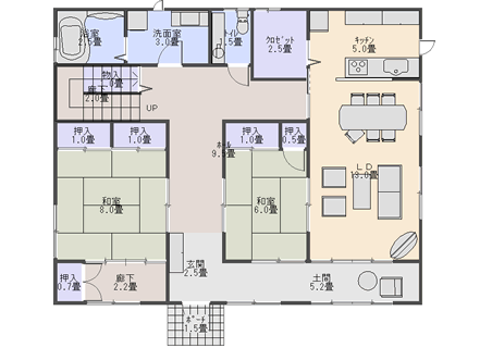 3LDK〜4LDK平屋の間取り20坪〜30坪・南玄関の家事動線が良い人気事例を紹介福井の注文住宅・工務店ノークホームズ。