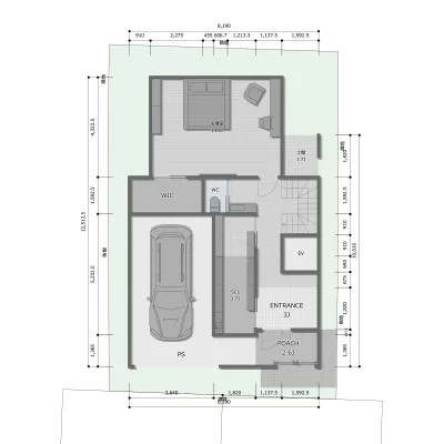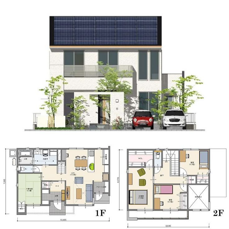 27坪〜30坪 2LDK南玄関で採光、縦長の2階建の家の間取り図「madree マドリー 」。