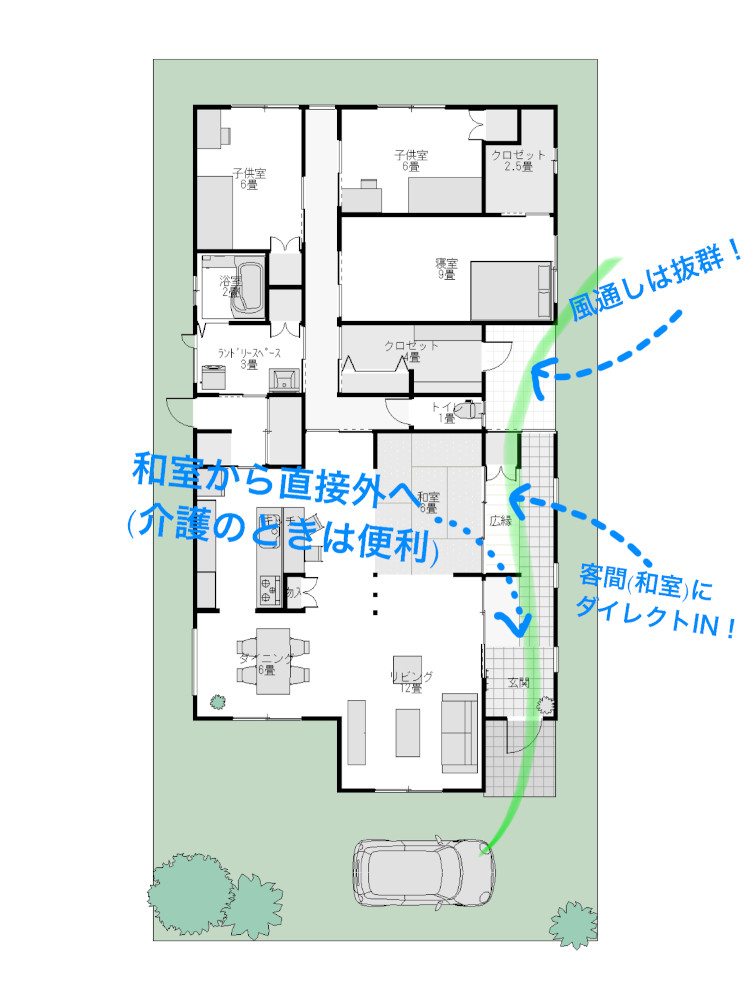 南玄関の理想的な間取り実例30~40坪の平屋でつくるこだわり住宅不二建設。
