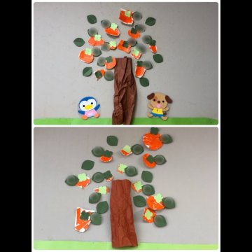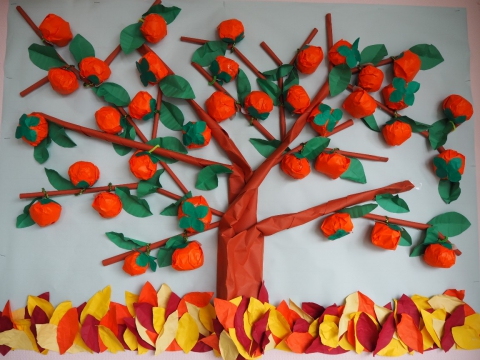 壁面飾り りんご落ち葉高齢者レク りんごの木 柿の木 秋の製作 Apple tree。