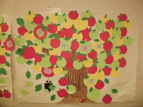 壁面飾り りんご落ち葉 高齢者レク りんごの木 柿の木 秋の製作 Apple tree。