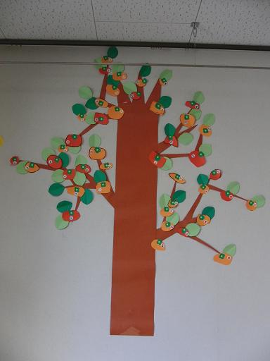 秋の壁面飾り くだもの高齢者レク りんごの木 柿の木 秋の製作 Apple。