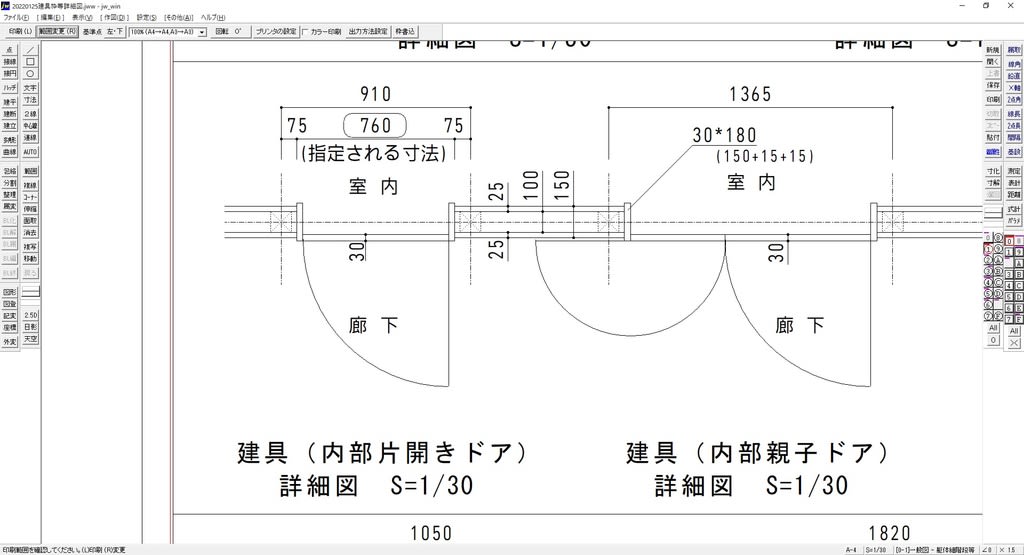 2級建具 建築CAD検定・作図例・JW-CAD・JWW・牛丼チャンネル・0:17 内部片開きドア・内部親子ドア・3:46 内部片引き戸・6:51 内部浴室・片開き戸- JW-CADの紹介・牛丼チャンネル。