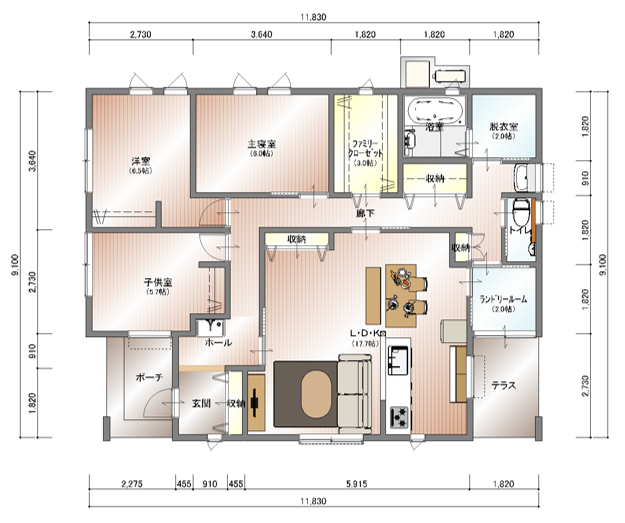平屋×3LDK×29坪ファミクロ・ランドリールーム・回遊動線!30坪以下で家事ラクな間取りNo.1-7咲くくらし。