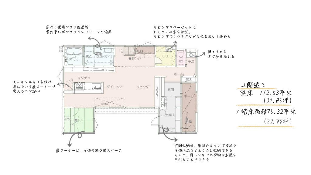 玄関の手洗い場やランドリールーム、多目的ホールなど、快適&便利に暮らせる間取りプランをご紹介株式会社コウエイハウジング。