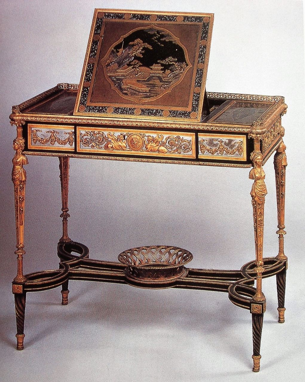 書き物机を描いた摺物、江戸時代、1800-10年頃 カラー木版画。