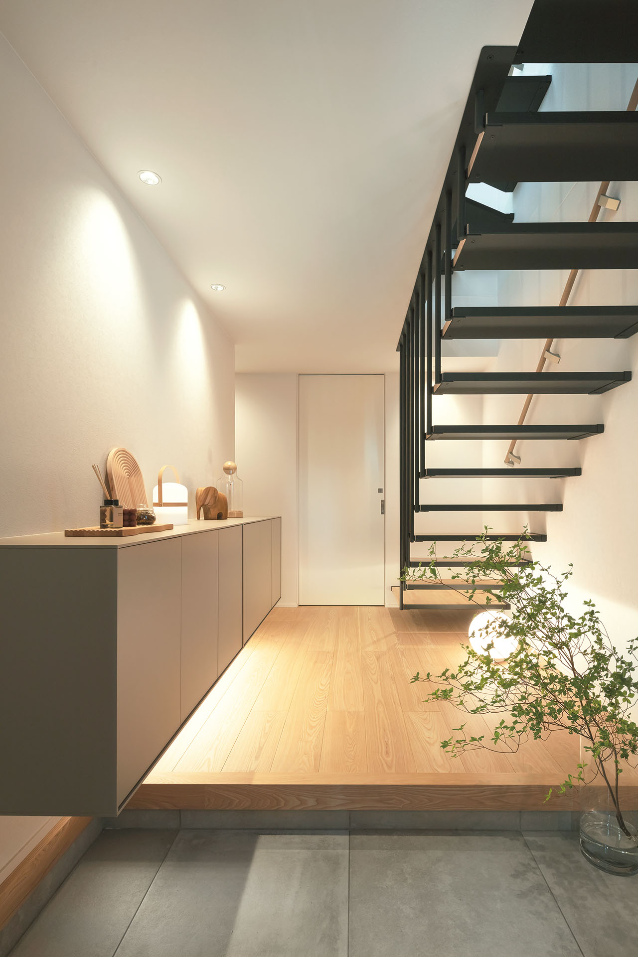 階段下2段を踊り場にし、シューズクローゼットを浮かせた、空間のこだわりが魅力的な玄関ホール-fevecasa フェブカーサ。