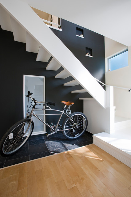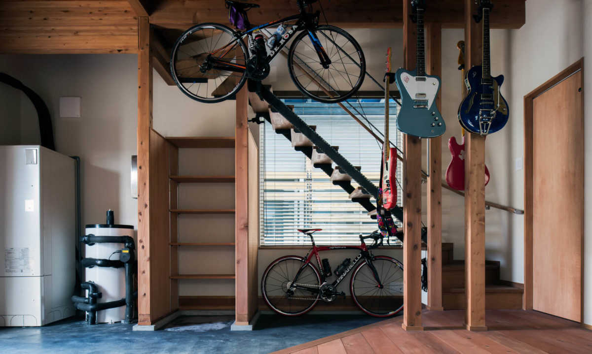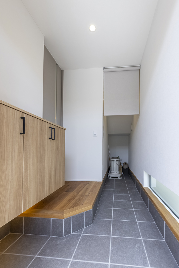 階段下には自転車も置ける土間を大きくした玄関 - 事例写真「ホビールームで趣味を楽しみ小上がりでくつろぐ収納たっぷりの狭小住宅」注文住宅のハウスネットギャラリ。