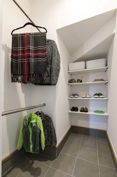 階段下のシューズクローク玄関の右側のシューズクロークは階段下のスペースを利用。三角の入り口がおしゃれなシューズクロークは、棚板の高さを自由に変更できる可動式なので、長靴やブーツなどタイプが違う履き物に合わせて変更できます。扉なしのオープンタイプ。