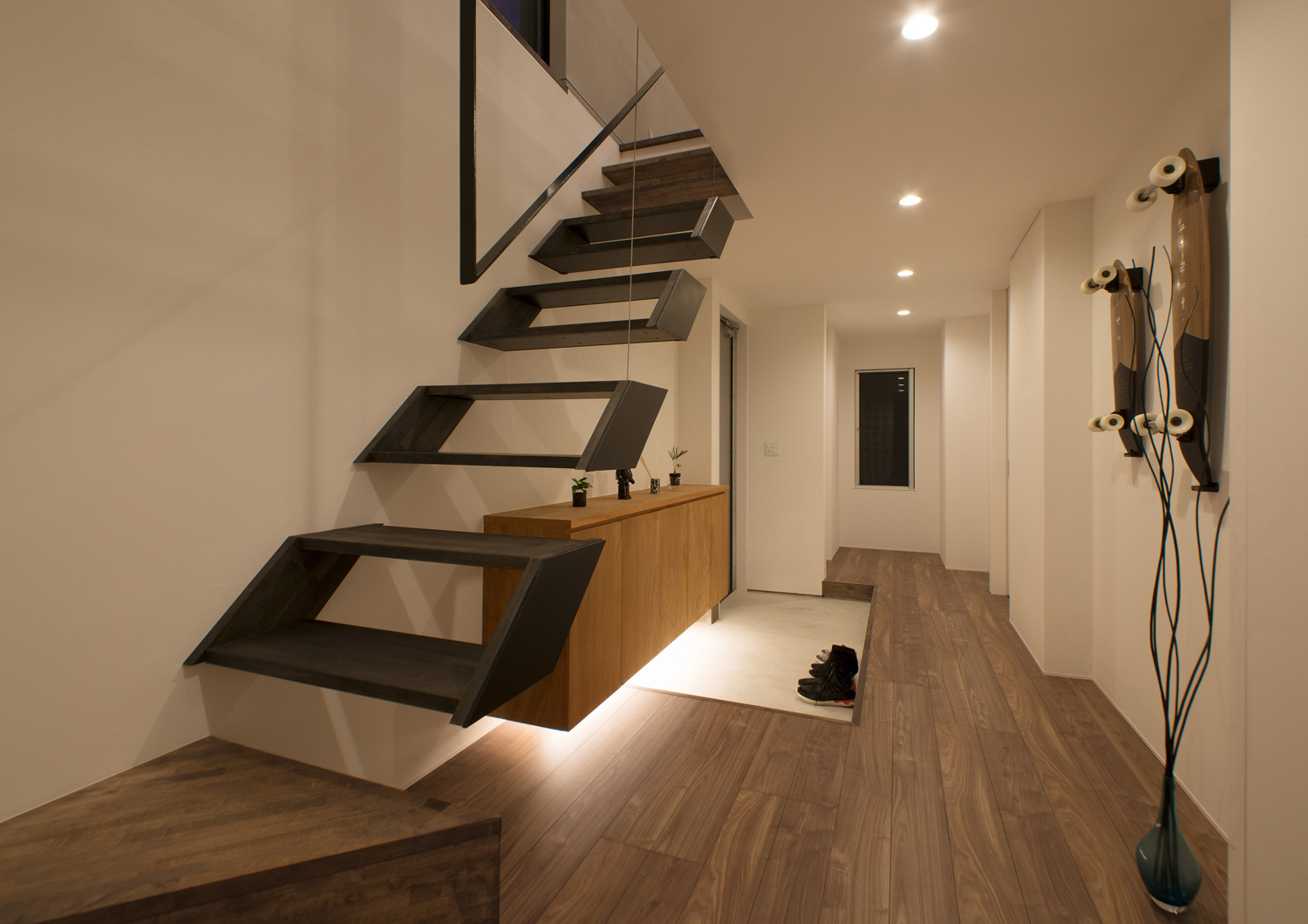 階段下の間接照明が上質な空間を演出するモダンな玄関 - 事例写真「カリフォルニアモダンな狭小住宅」注文住宅のハウスネットギャラリ。