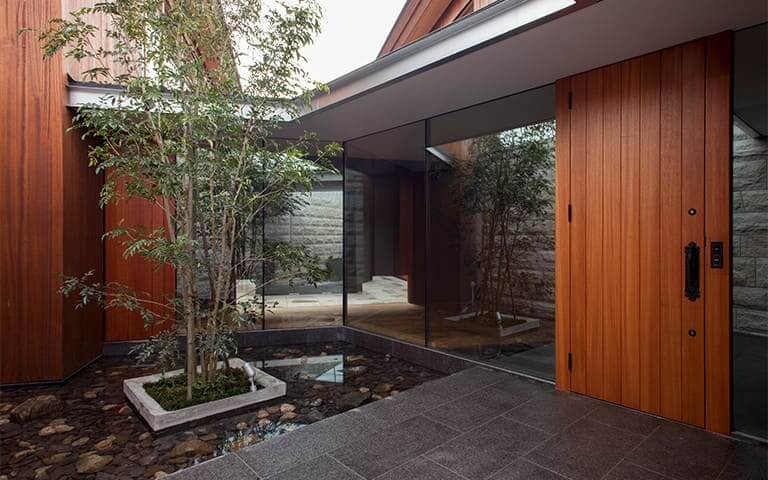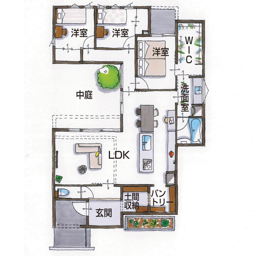 SUUMO2000万円台 平屋 30坪 3LDK 中庭 間取り図 まるで海外の邸宅さながら。天然石とヘリンボーンが彩る平屋 - グランハウス一級建築士事務所 茜部オープンスタジオの建築実例詳細注文住宅。