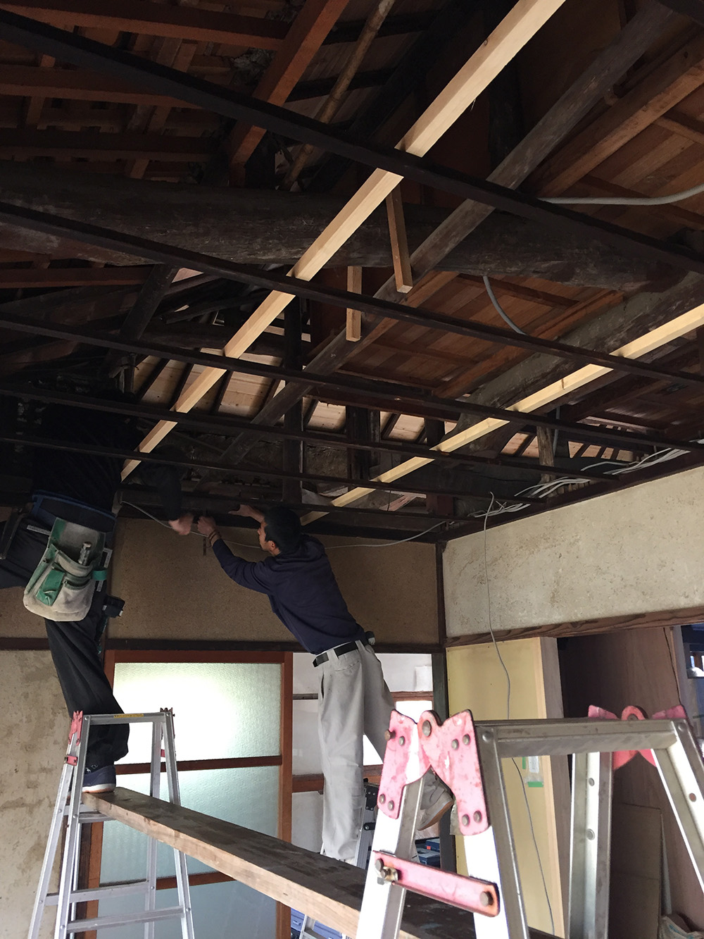 古民家リノベーション 古民家の低い天井を解体。解体したら煤竹沢山出て来た。