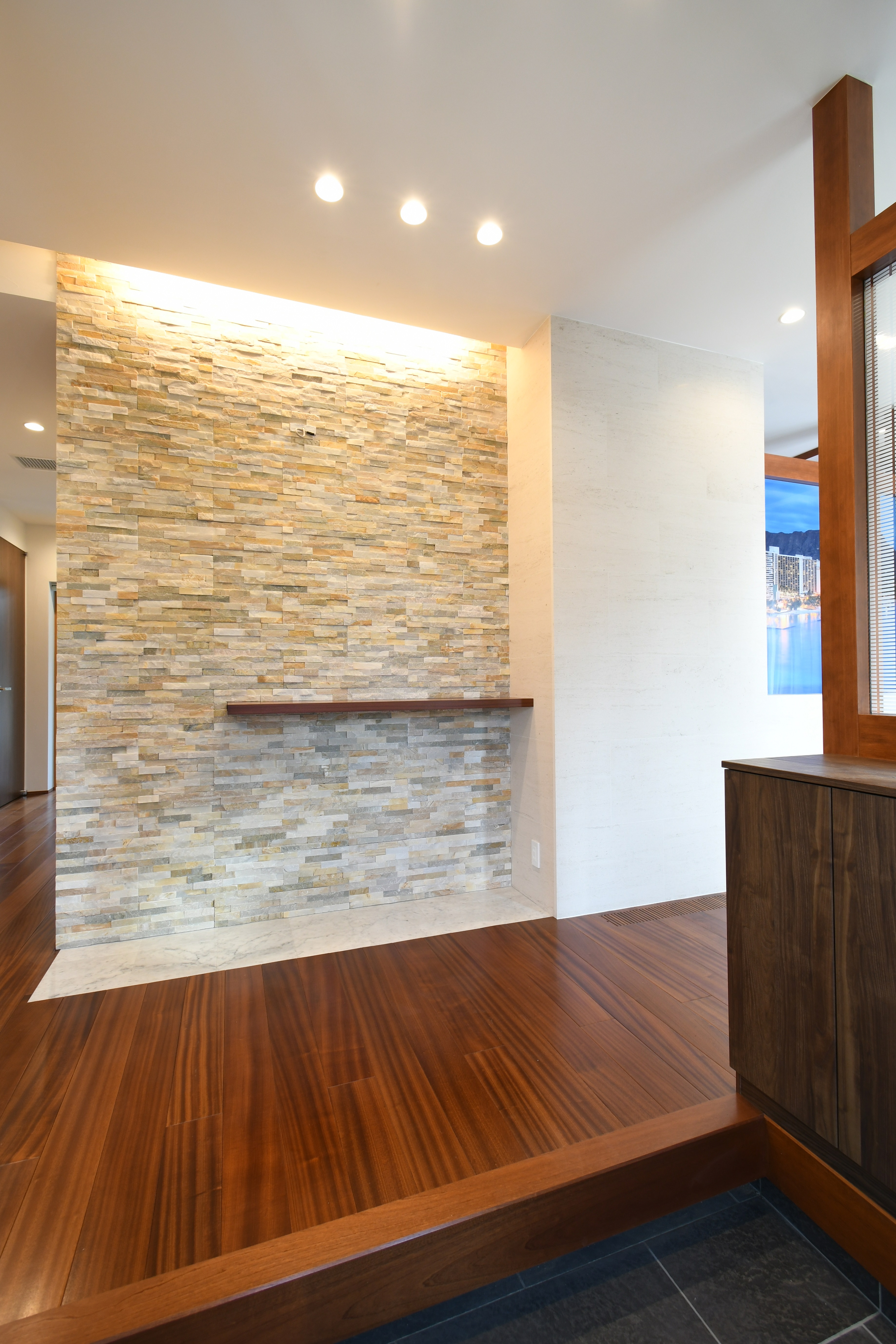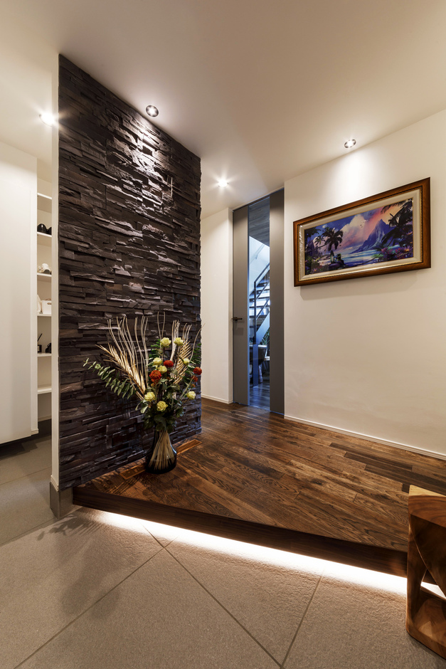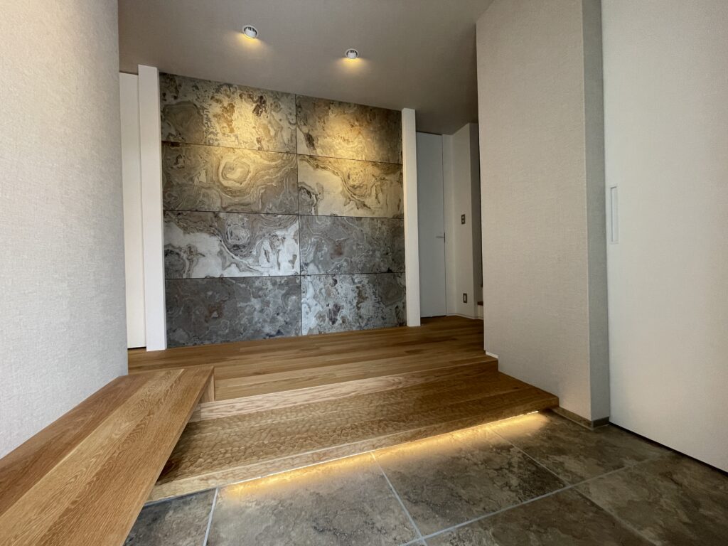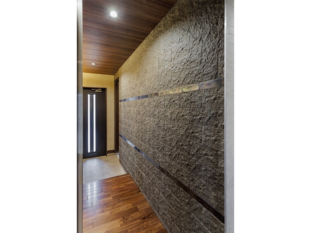 玄関を開けると正面の天然石タイル張りの壁が存在感を放つ。間接照明が質感を強調し、高級感と奥行きを演出。ブラックチェリーの無垢床とも相性抜群。