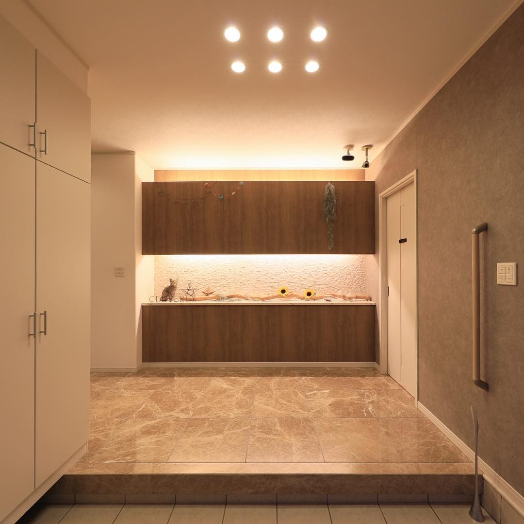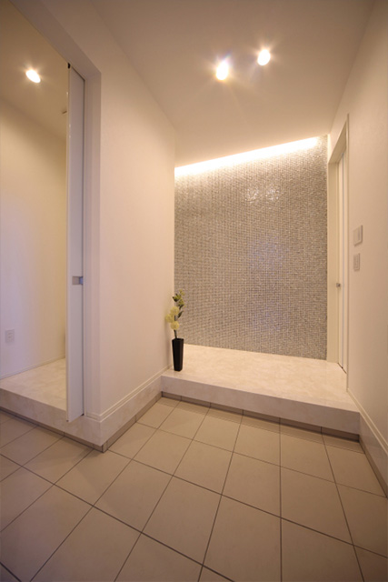 間接照明が映えるタイルの壁がアクセントの洗練された玄関 - 事例写真「Favorite tiles&Largestorage」注文住宅のハウスネットギャラリ。