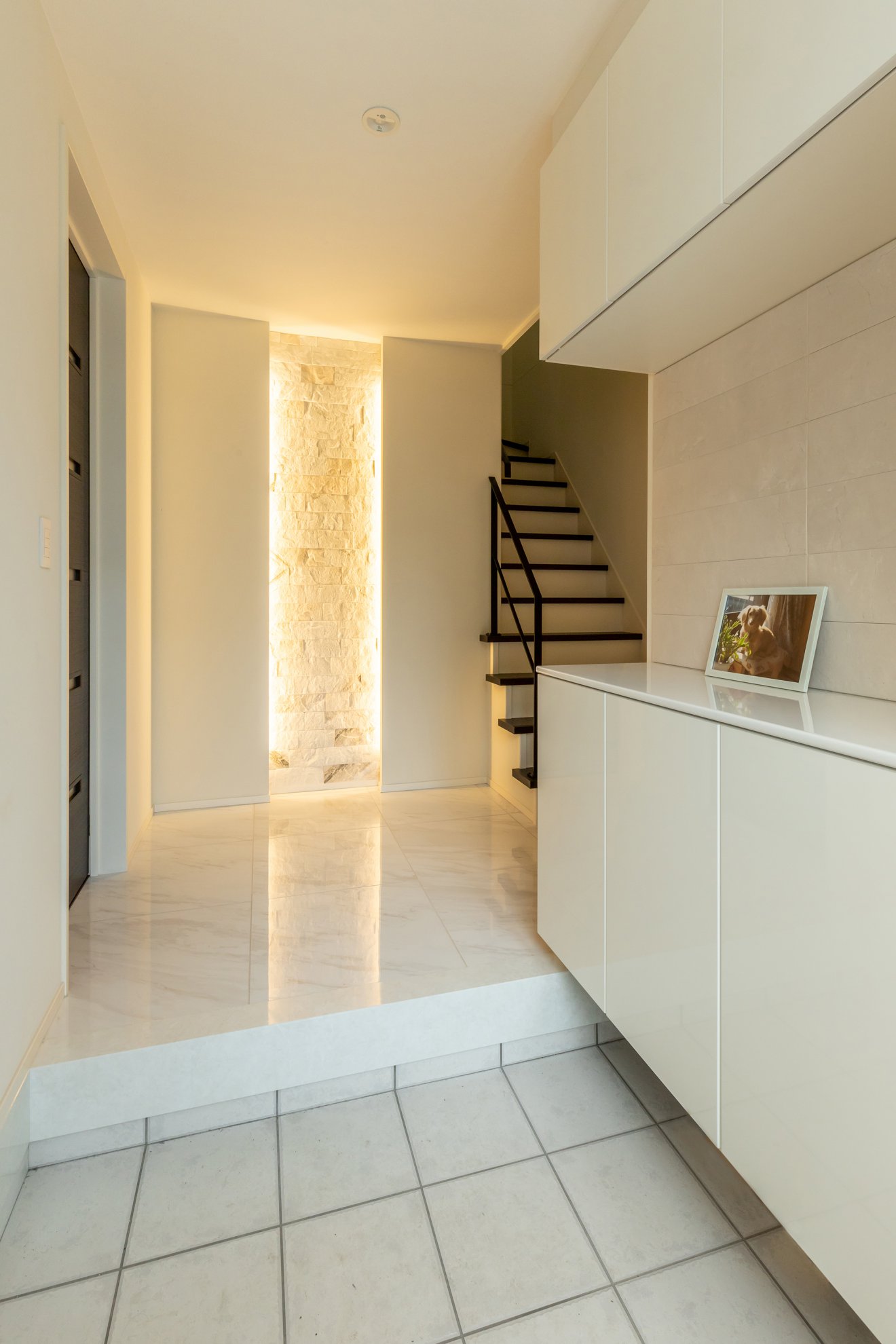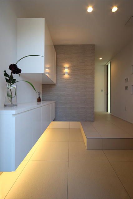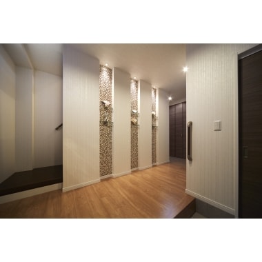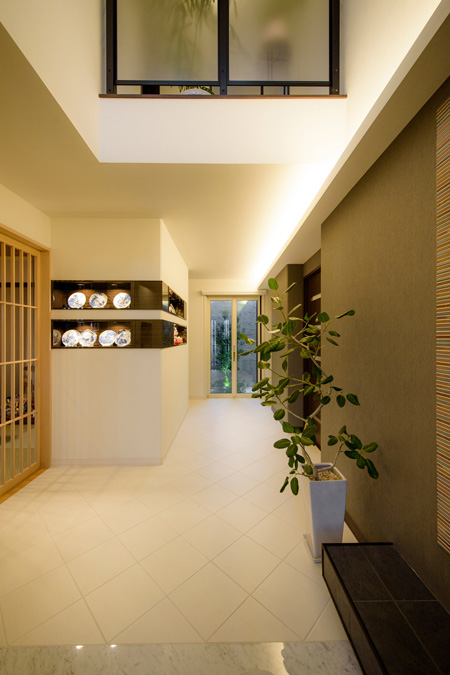 訪れる人を迎える広々とした玄関ホール。タイル壁に間接照明をあてることで素材の質感が浮かびあがる。 くふうイエタテ。