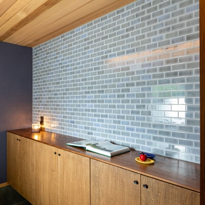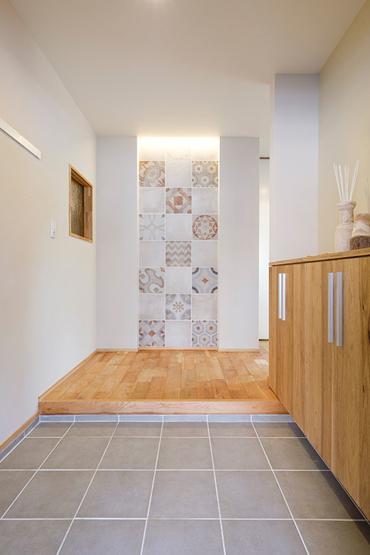 タイル壁がアクセントのおしゃれな玄関。