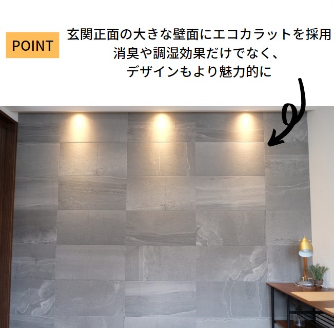2WAYの玄関ホール。正面に見えるラグジュアリーなタイルの壁は調湿・消臭効果にすぐれたエコカラット。全身鏡も設置し、お出かけ前に服装チェッも。