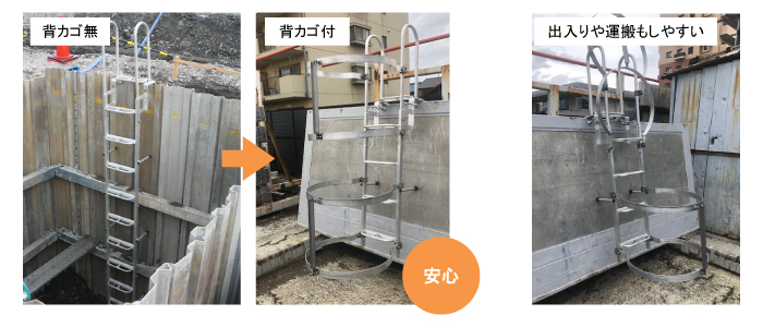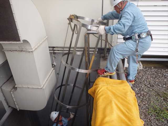 大日本興業株式会社安全ガードの役割を果たす梯子に付帯する””背カゴ””。