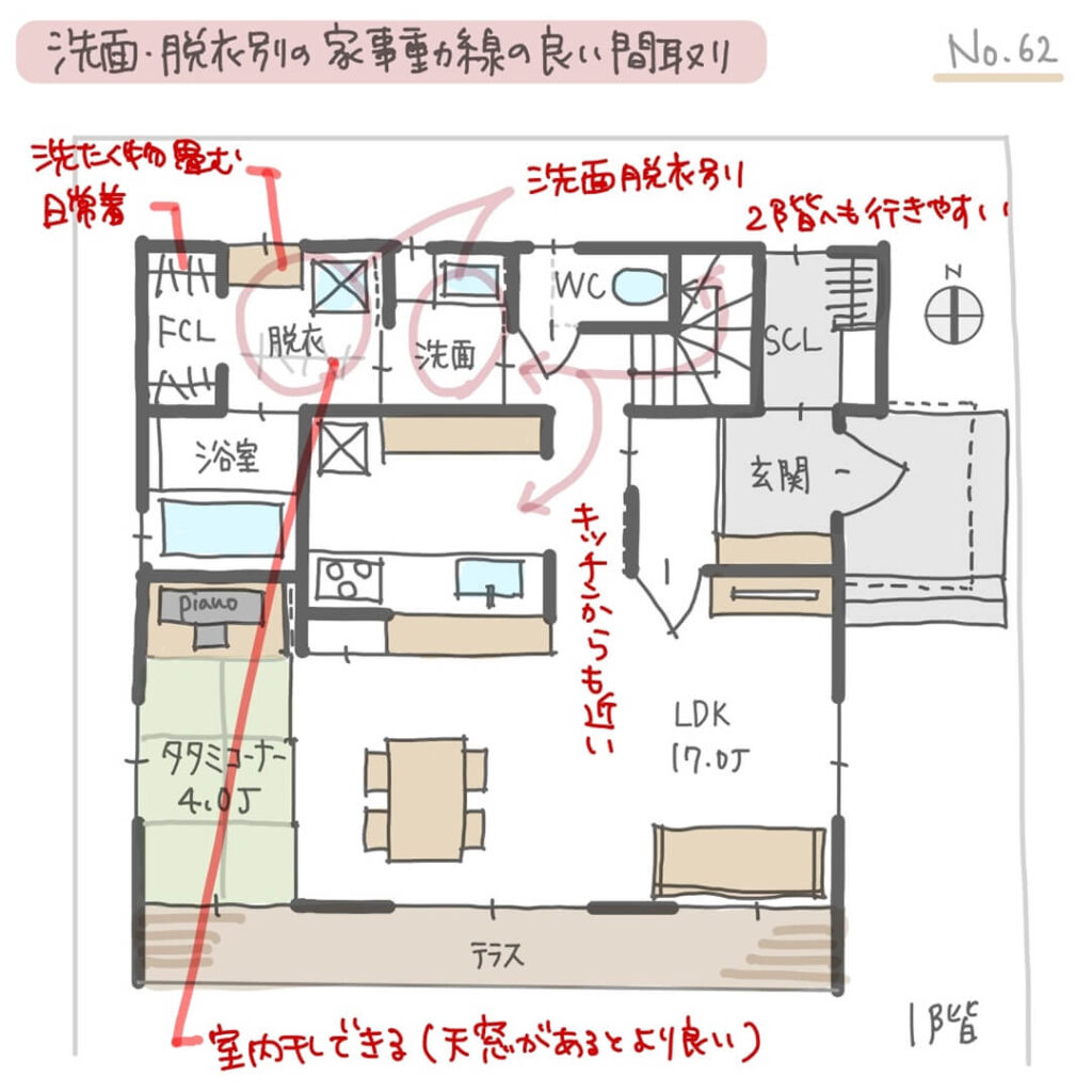 洗面・脱衣室別の家事動線の良い間取り 32坪3LDK2階建 No.62みゆう間取り相談室。