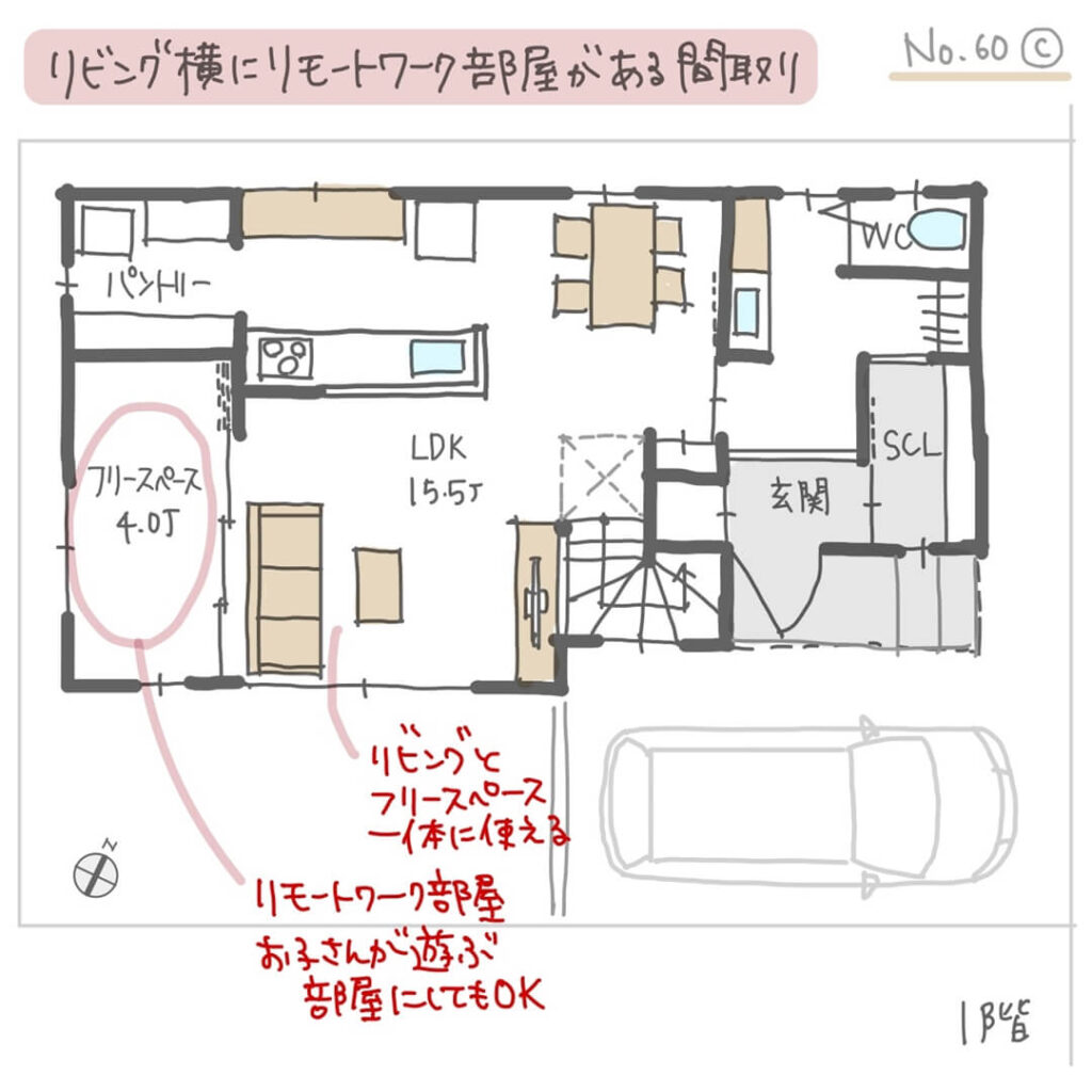 43坪 3LDK床の段差で視線をコントロール、空間にメリハリ生まれるピットリビングの家の間取り図「madree マドリー 」。