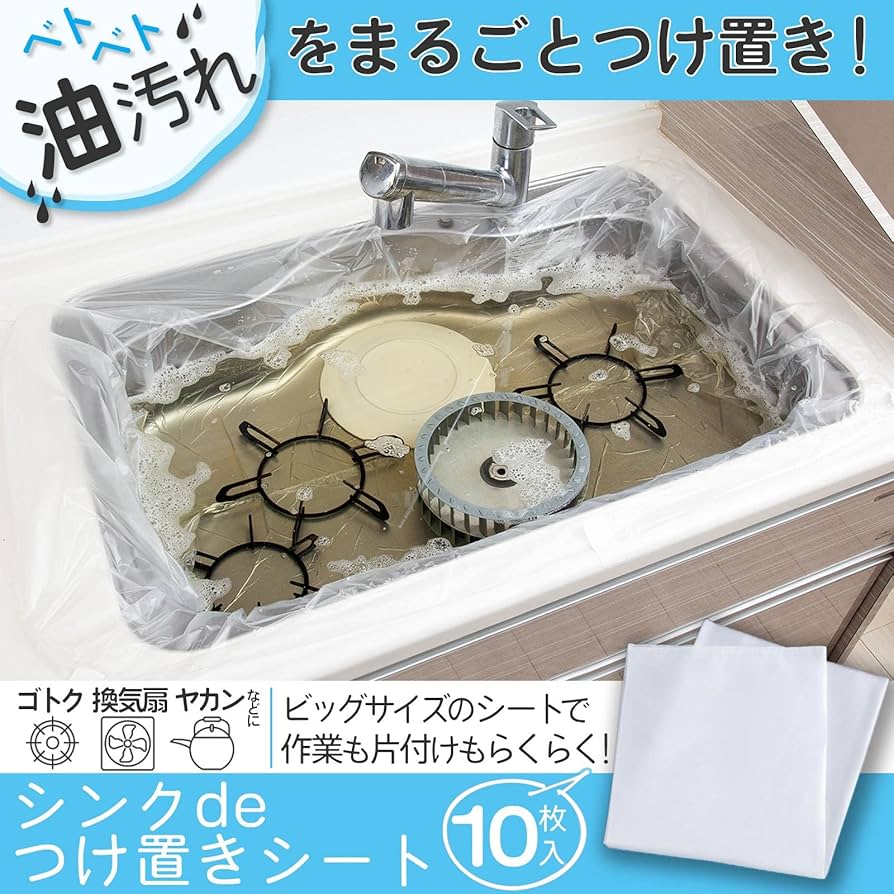 Amazonコモライフ シンクdeつけ置きシート 10枚入 シンク つけ置き 浸け置き シート 袋 つけ置き洗い 大判シート 作業効率アップ 片付け簡単 時短 節約 掃除 キッチン 排水口 換気扇 やかん 食器 五徳 油汚れ外形:約96×50cm使用時:約縦30×横96cm×マチ40cm。