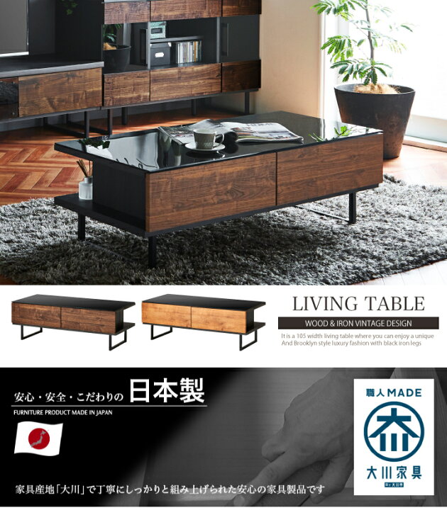 5%OFFクーポン配布中テーブル 国産 大川家具 幅105cm ヴィンテージ風 アイアン ナチュラル ブラウン インダストリアル ガラステーブル完成品 木製 ローテーブル センターテーブル 国産 table おしゃれ カフェテーブル 引出付 長方形 Vault ヴォルトローズ。