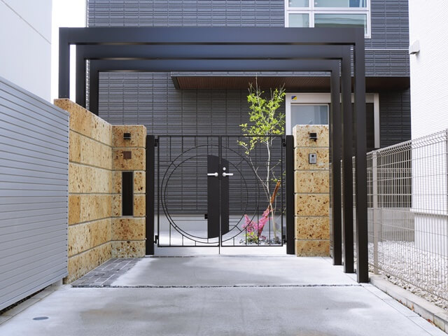 アイアン門扉とデザインブロックの心踊る門周り – エクステリア製品 SBIC エスビック株式会社。