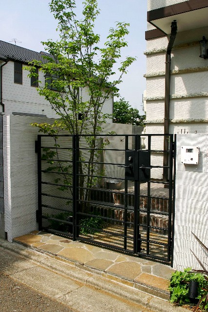 通路のエリア分けを担う、ロートアイアンの両開き門扉。 窓より低くデザインすることで、空間が閉鎖的になるのを防いでいます。整然と並ぶ小さな装飾が、楚々とした印象です。玄関エントランス門扉建築アイアン門扉門門扉デザイン両開き門扉外構外構。