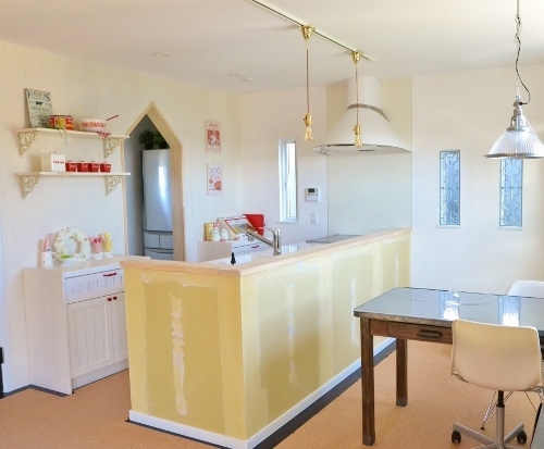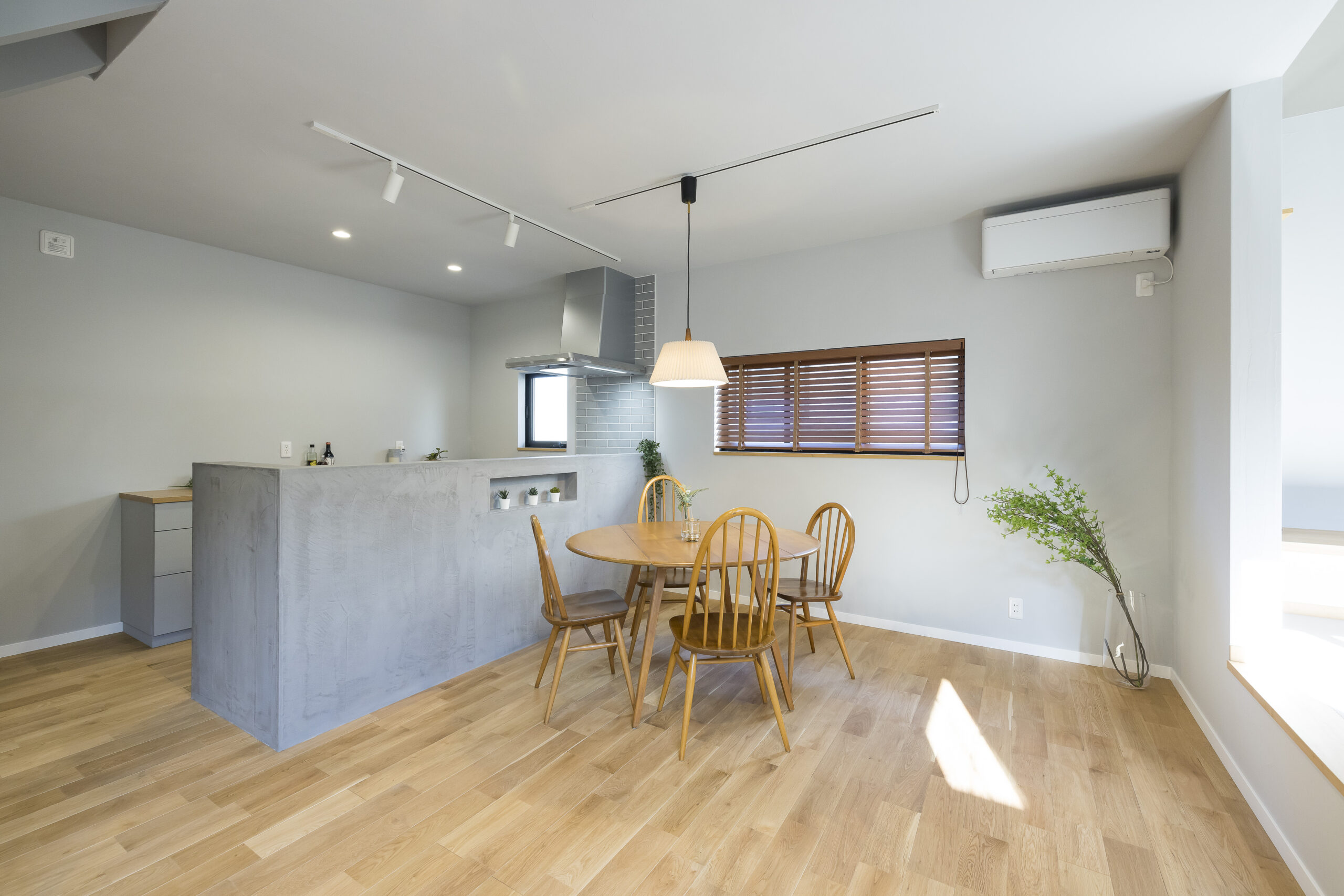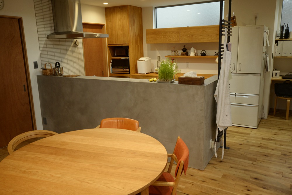 見学会する住宅の続きです。 キッチン腰壁はモールテックスで仕上げました。カウンターをご購入予定のダイニングテーブルの高さ、色と素材を合わせて作ってあります。一体感あるダイニング空間を創造し、料理をしながら、お子さんが勉強している風景が想像できます。 腰。