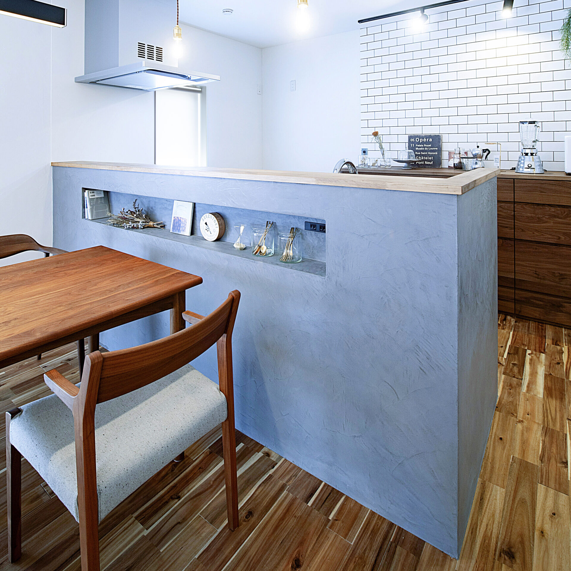 キッチンカウンター腰壁のMortex左官事例熟練の技術でスイス漆喰の塗り壁を施工する東京・葛飾の左官工事会社、八幡工業。