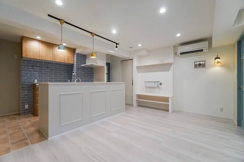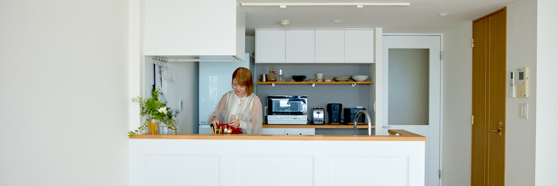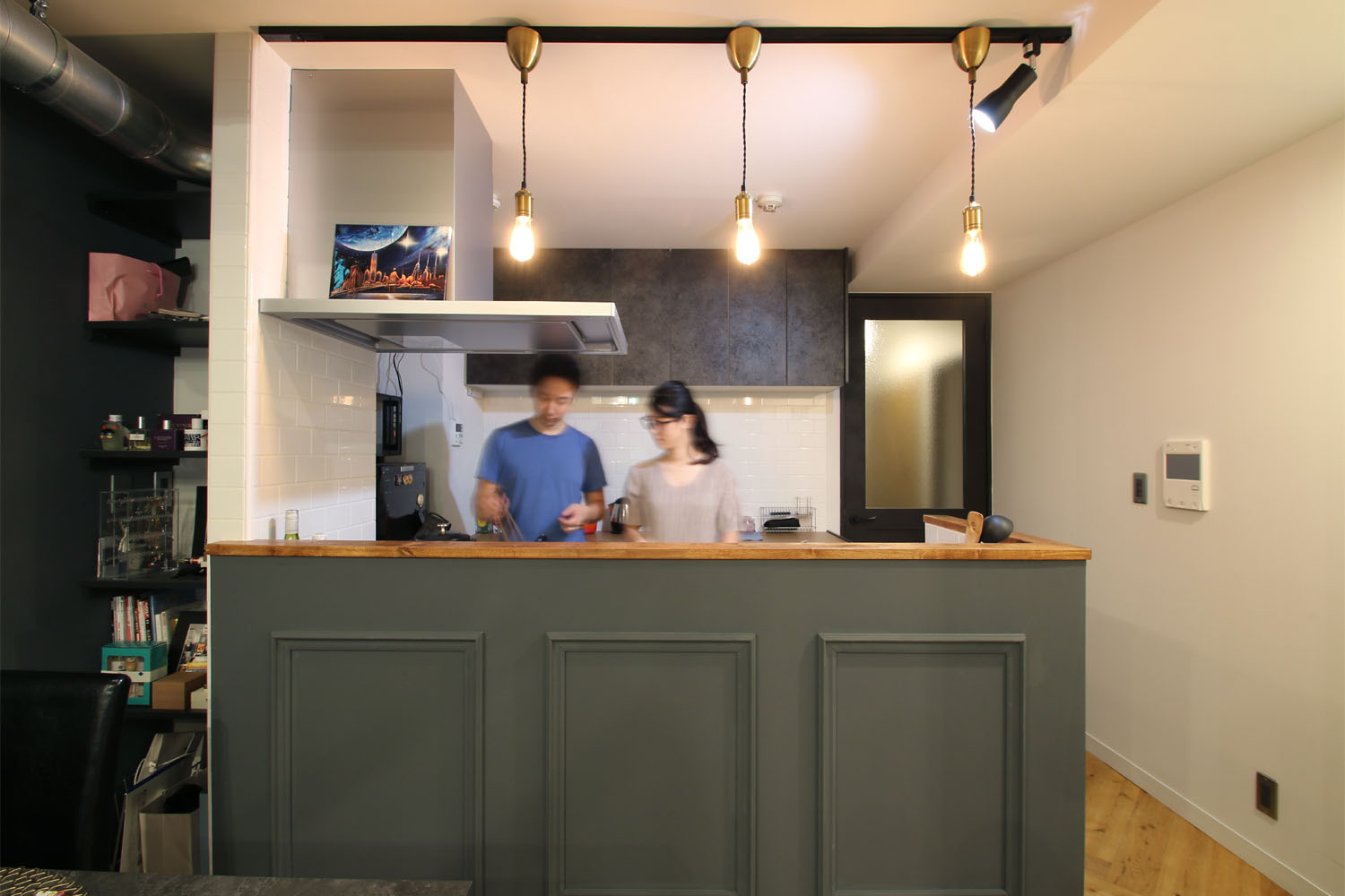 モールテックスで腰壁を塗装したキッチン 吹き抜けで開放感抜群のマンションリノベーション- キッチン事例SUVACO スバコ。