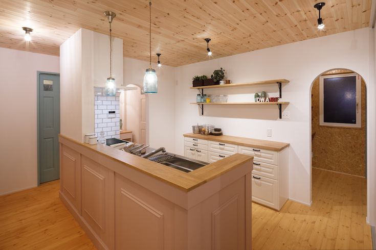 カフェスタイルのオープンキッチン。腰壁にモールディング 立体的な造形模様 を造作して、空間が甘くなりすぎないようにアクセントをつけた くふう。