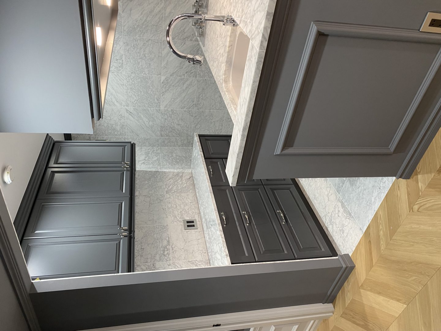 グレーのエレガントなクラシックI型キッチンをオーダーメイドで作る オーダーキッチン。