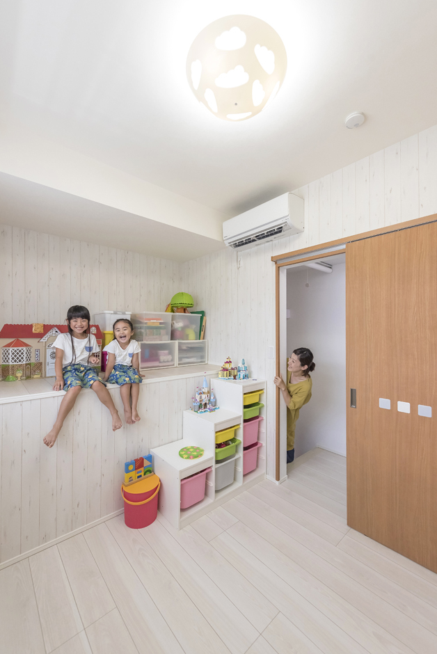 小屋裏を利用した収納がある子ども部屋。部屋の中の高低差は、今は子どもたちの格好の遊び場として活躍。ゆくゆくはロールスクリーンなどで仕切り、洋。
