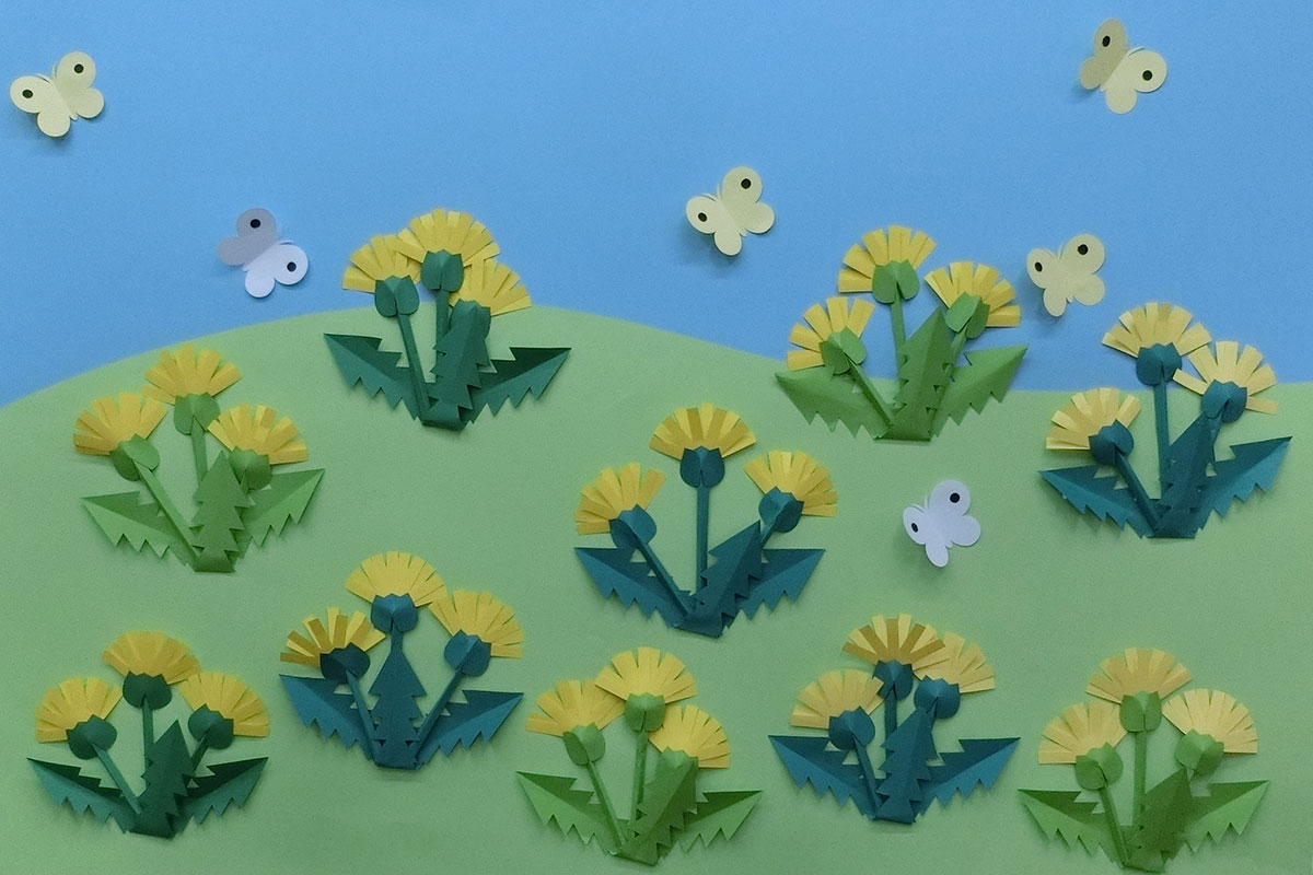 工作ネタ たんぽぽとてんとう虫Dandelion andLadybug 3・4月型紙有り壁面飾り高齢者レク・作業療法OT・デイ・保育立体おりがみorigami DIY。