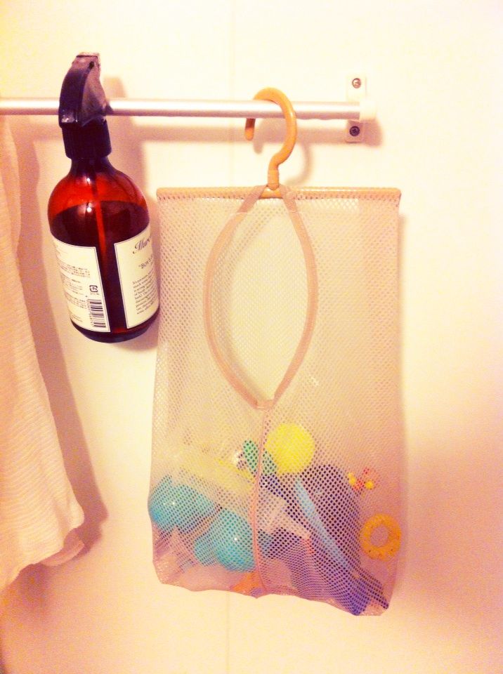 写真あり マンションのお風呂のおもちゃは100均のメッシュバッグで収納がおすすめ!オシャレじゃないけど安い・簡単・実用的な方法乳幼児ママの、笑えない子育て日記。