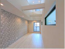 玄関とリビングをつなぐ細長い土間が建物の奥行き感を強調。自転車置き場。