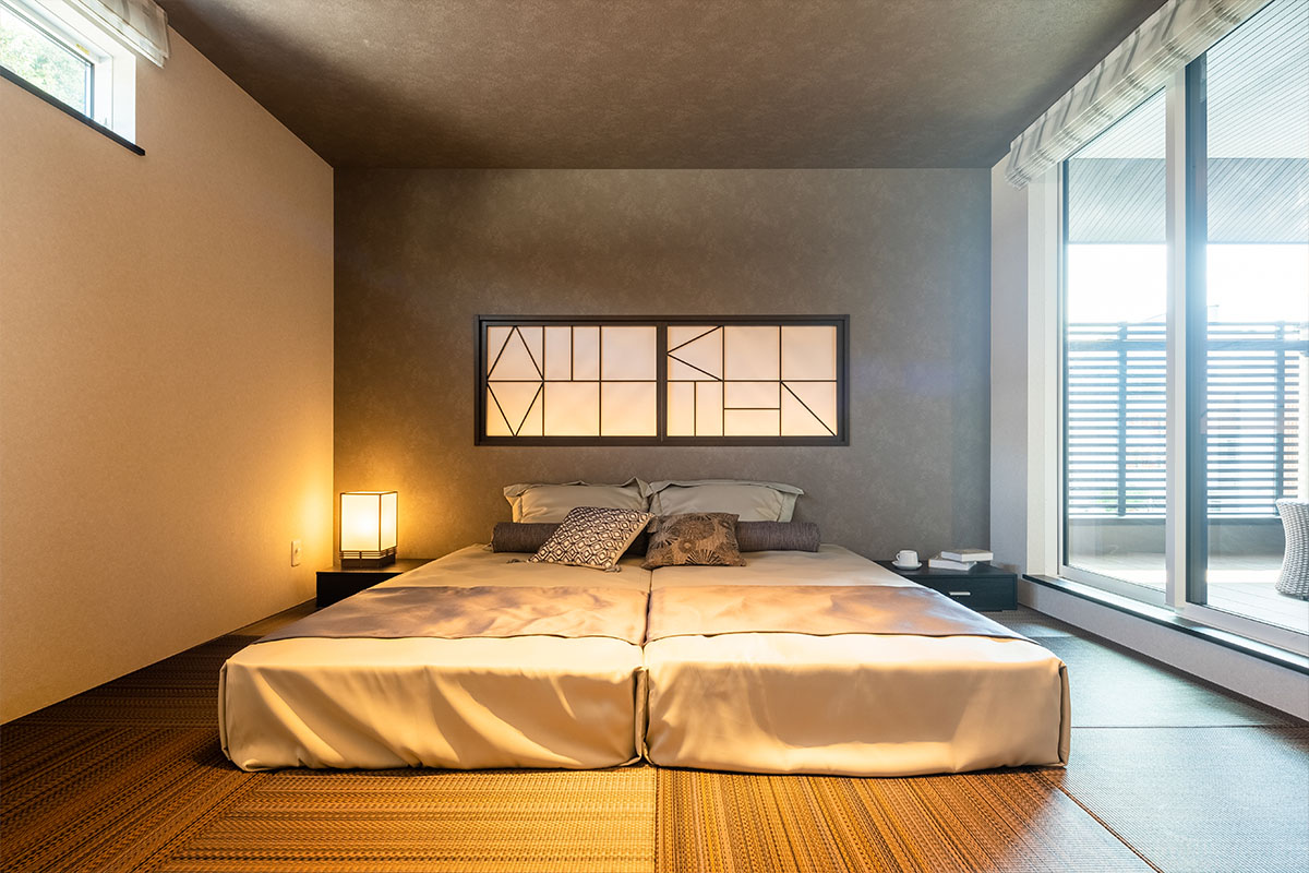 和モダンな照明と落ち着いた色調が印象的な、リラックスできる畳敷きの寝室 - 事例写真「鶴ヶ島モデルハウス×埼玉県」注文住宅のハウスネットギャラリ。