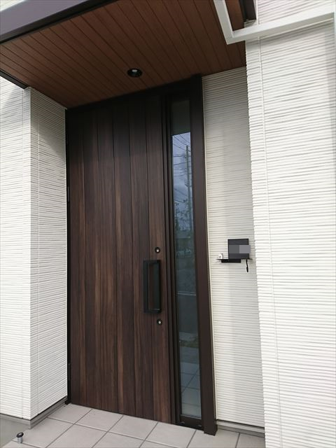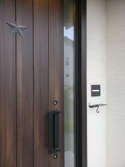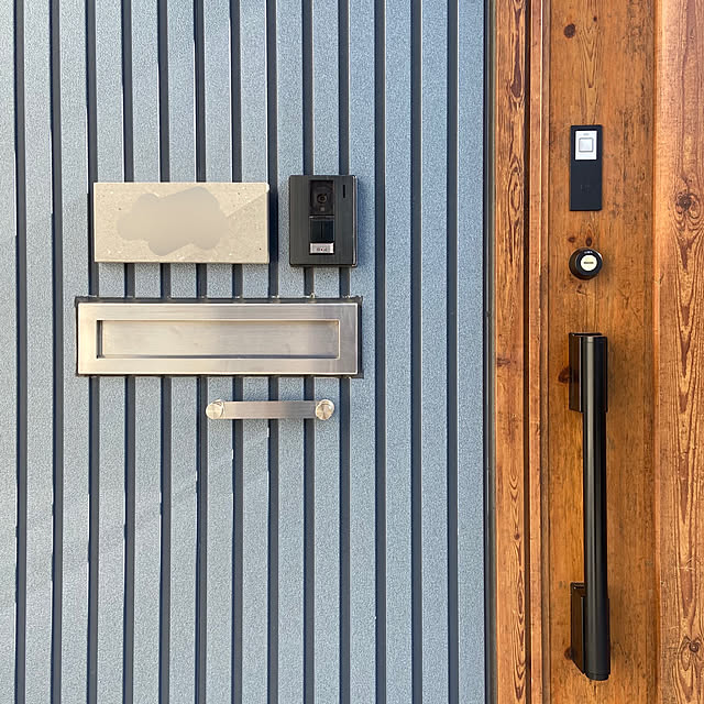 玄関ドア もお気に入り 🚪 . リースつけてたときのだから結構前の写真だけど📷扉 は ykkap の木目調 カラーは マキアートパイン洋風カーブハンドル .ポスト は リクシル の外壁につけるタイプで 傘掛け は カワジュン . 表札は楽天とかYahoo!でオーダーできるやつだ。