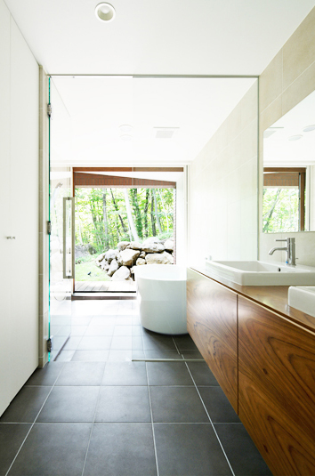 浴室・バスルーム 外と繋がるバスルーム重量木骨の家。