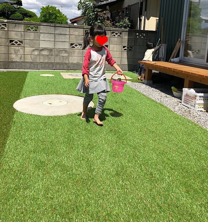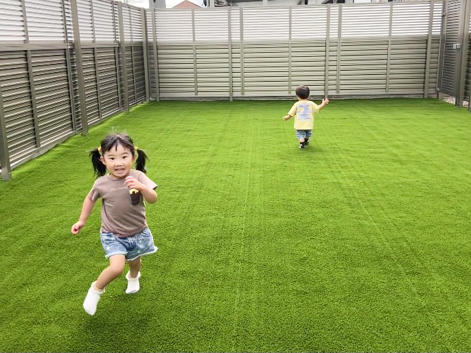 砂利庭の上に"リアル人工芝"を敷いたら、子どもが遊びやすくなった!景色も最高!ゴリミ。