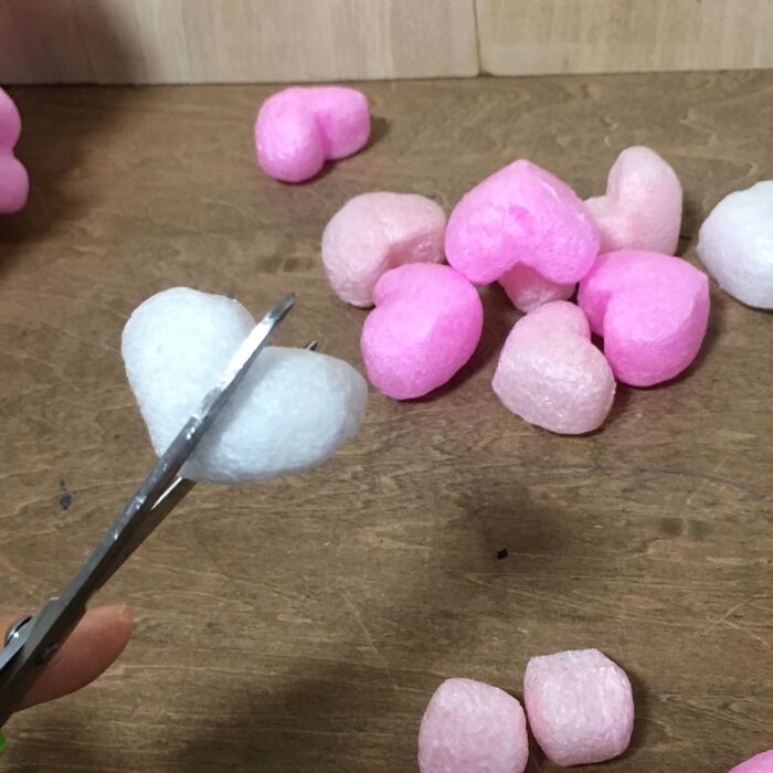 まさかのアレが可愛く😍✨, 今回は1回買うと余りがちな,コーンクッション材を使って, すごく簡単で可愛いの作るよ💕, 作り方は簡単✨,クッション材のハートの形を活かして, 蝶々にしたり, 四つ葉のクローバーにしたり, はさみで半分に切って, 違う色同士を貼り合わせたり、,切ったものを5個, 梅の花みたいに貼り合わせたり , 色んな形を作ってみてね💕, 貼り合わせる時に糸を間に通すと,。